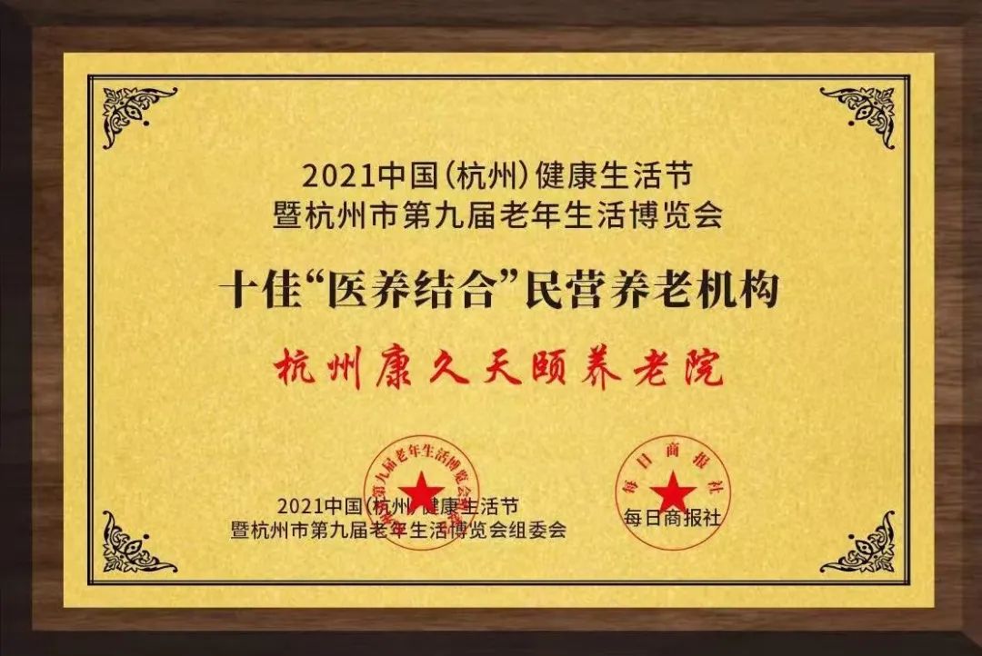 日前,康久集團(tuán)旗下杭州康久天頤養(yǎng)老院榮獲杭州市十佳“醫(yī)養(yǎng)結(jié)合”民營(yíng)養(yǎng)老機(jī)構(gòu)稱號(hào),此次評(píng)選由杭州市養(yǎng)老事業(yè)促進(jìn)會(huì)、每日商報(bào)社聯(lián)合舉辦。