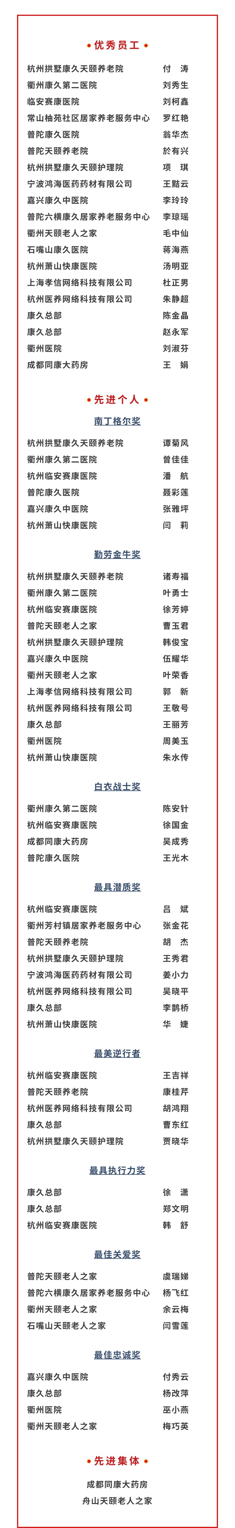 2021年,這些獲獎(jiǎng)員工在各自崗位上兢兢業(yè)業(yè),努力奉獻(xiàn),為全體員工樹立了榜樣,也對集團(tuán)營收及利潤的持續(xù)增長提供了有力的支撐,讓康久集團(tuán)在康養(yǎng)產(chǎn)業(yè)的創(chuàng)新生命力更加強(qiáng)大。