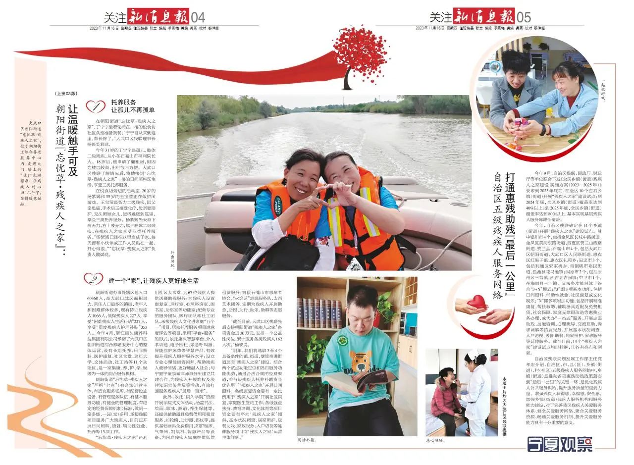 11月16日,《寧夏日報》旗下《新消息報》及《寧夏新聞網(wǎng)》等媒體發(fā)布《“殘疾人之家” 有愛更“有料”》一文,聚焦朝陽街道“忘憂草·殘疾人之家”建設模式。